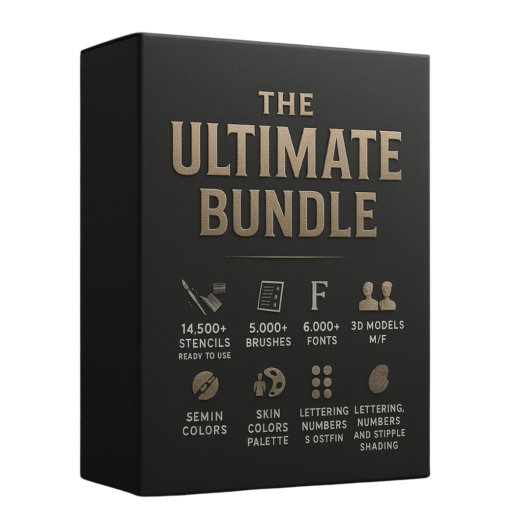 The Tattoo Artists Mega Bundle - Your go-to resource for high-quality tattoo design. Over 5.000+ brushes, 14.500+ stencils & 6.000+ fonts.